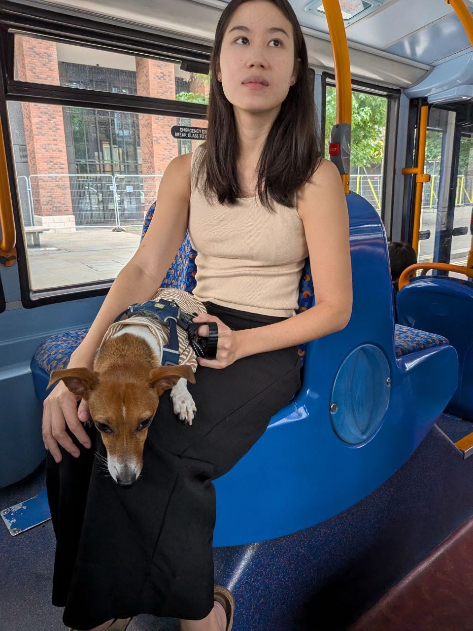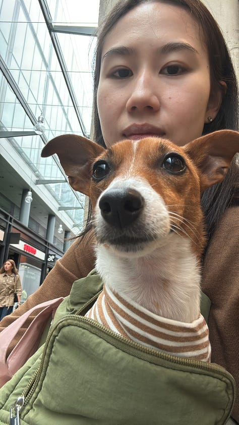 Thanks to all her training of being in her bag in Singapore, she’s been really easy to bring around. She’s really scared of being in the tube though. Bus is easy, as it’s not so different from Singapore.